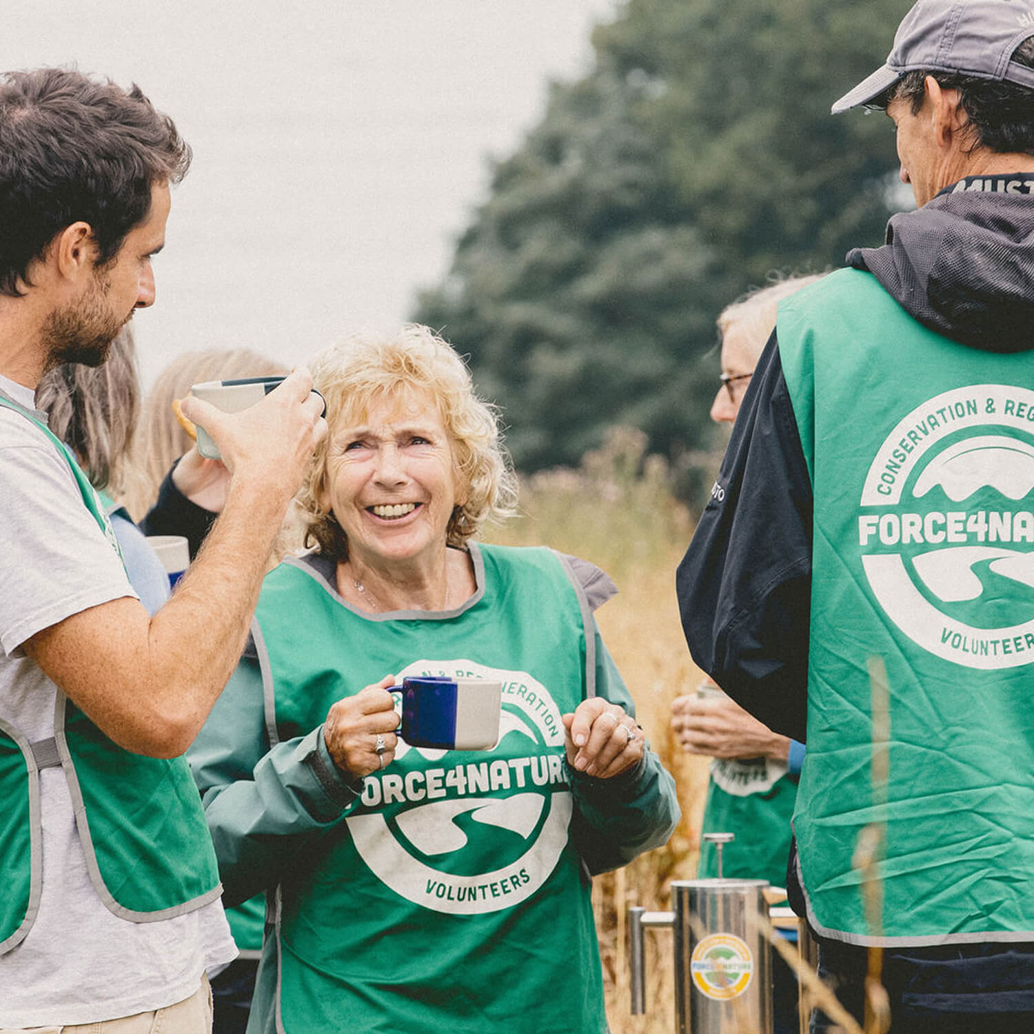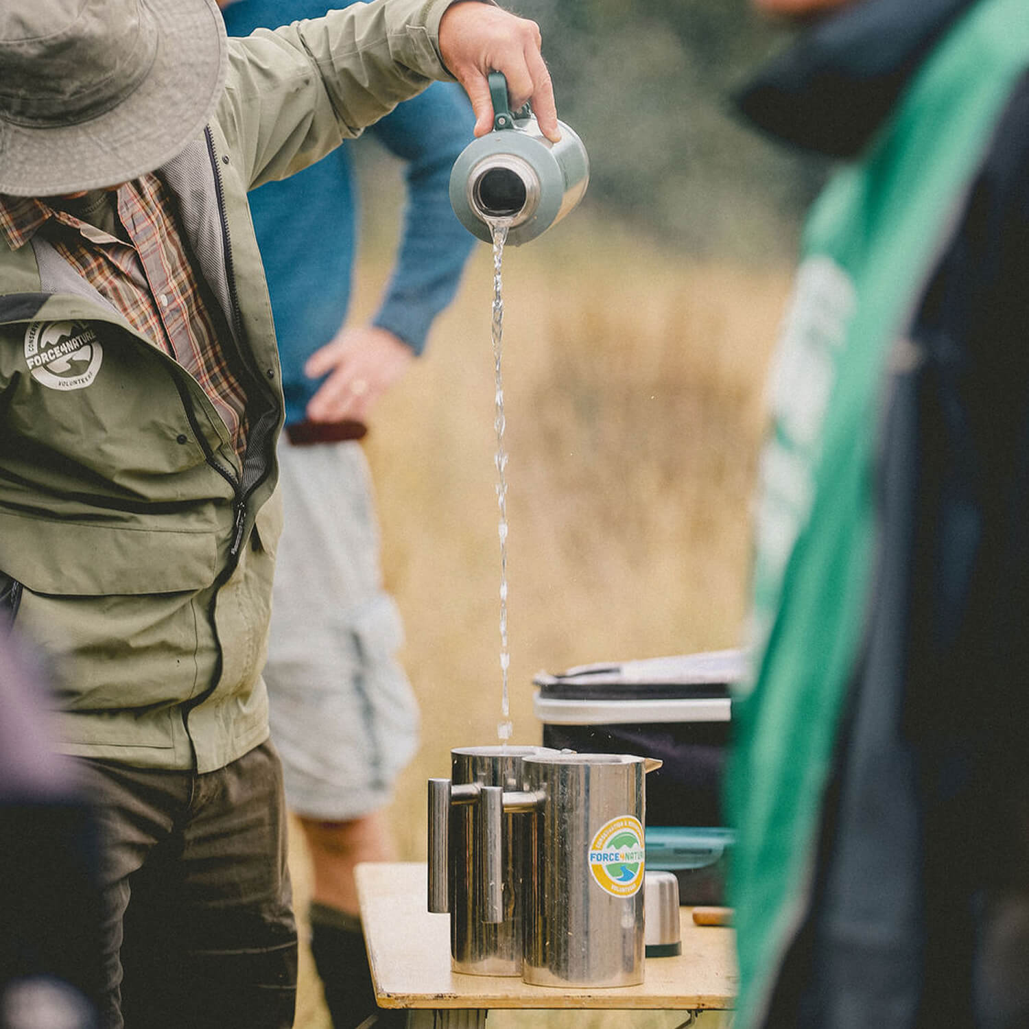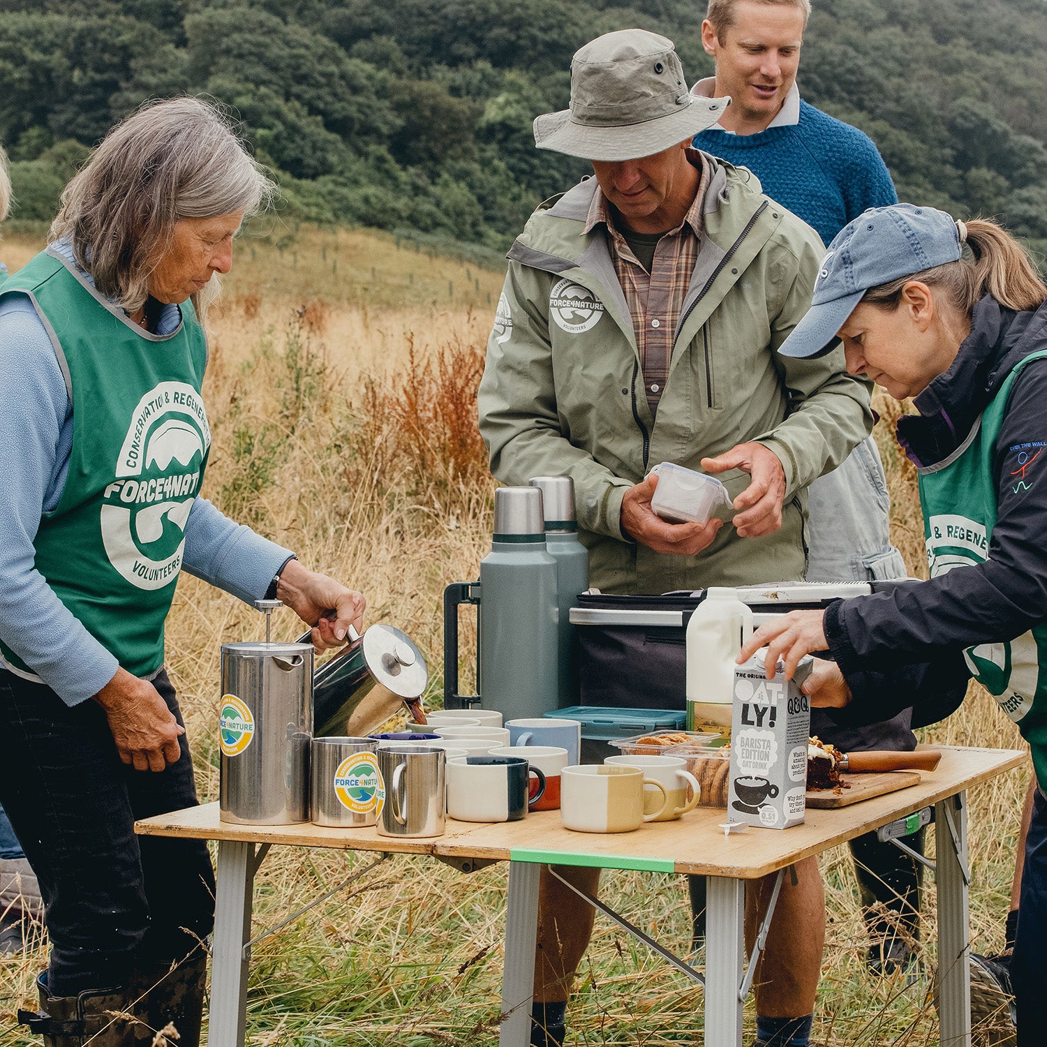 Each volunteer day kicks off with a cup of tea or coffee and a catch-up — Gary makes sure priorities are in order! A camping table is set up, in this case overlooking the beautiful Mothecombe Bay, and out come two enormous hot water canisters, a variety of teas, and fair-trade fresh coffee. Soon everyone is pouring, sharing, and enjoying a drink, not to mention the cake and biscuits. Even the typical British drizzle can’t dampen the spirits. Conversations flow, stories from the week are shared, and friendly banter sparks plenty of laughter.